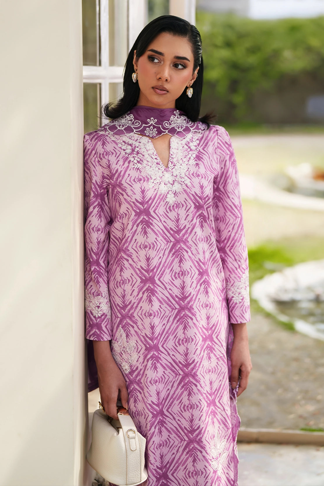 Paired with straight-cut trousers and a flowing crinkle chiffon dupatta enhances fluidity and feminine elegance.
