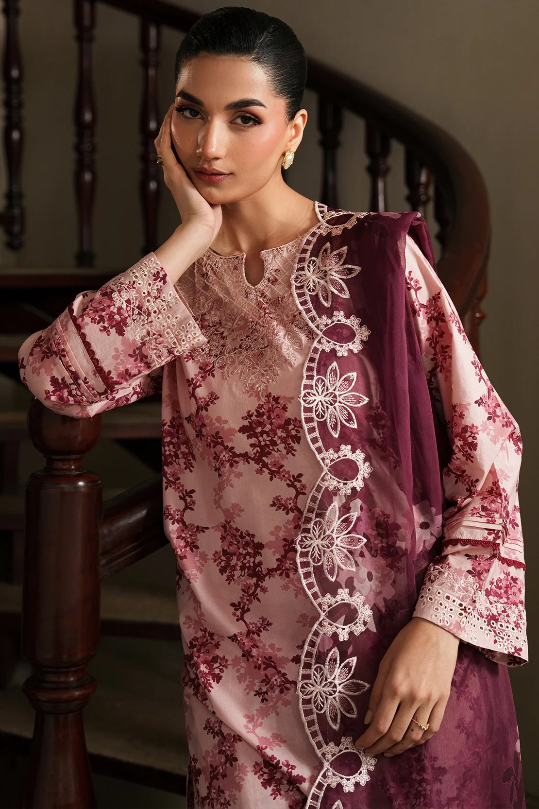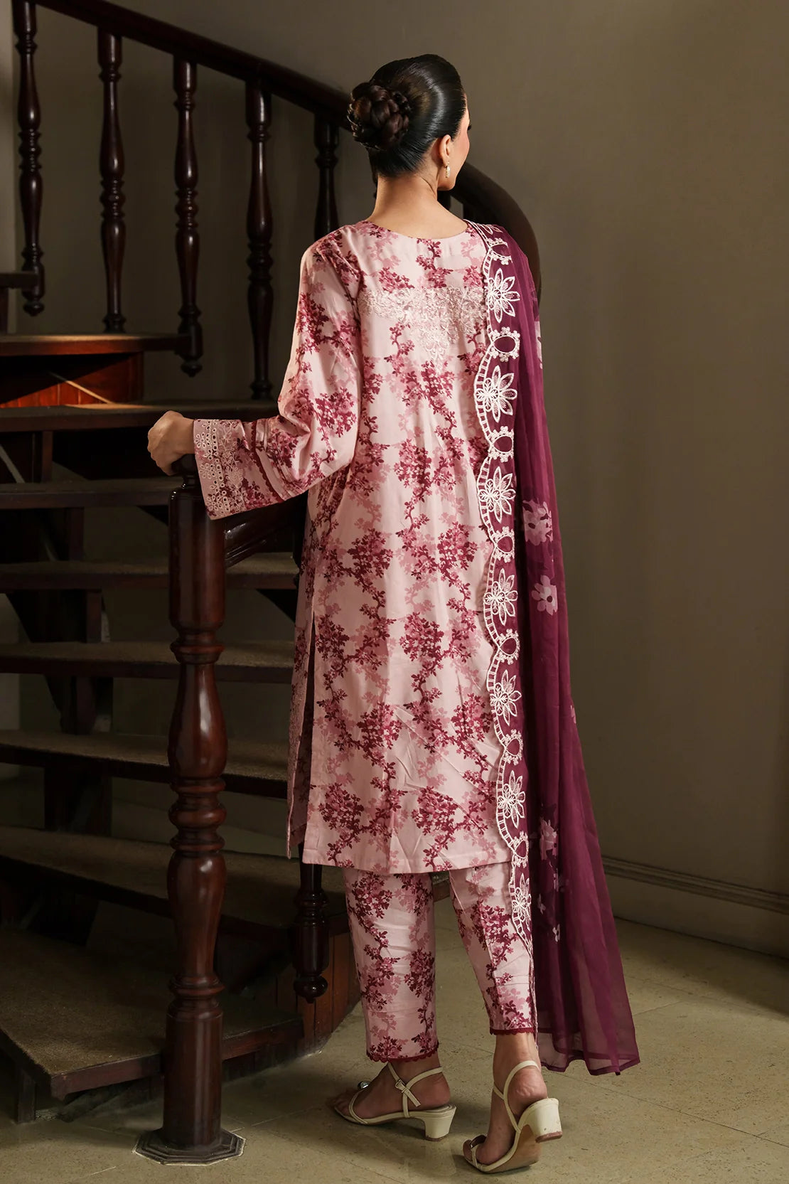 Rosewood Reverie, a graceful silhouette enhanced with delicate florals in an all-over digitally printed pattern, radiating refined femininity. Intricately embroidered motifs and a statement embroidered border lend depth and elevated craftsmanship to the shirt. The digitally printed embroidered crinkle chiffon dupatta drapes with soft fluidity, adding contrast and elegance. Paired with luxury digitally printed trousers, this ensemble captures modern sophistication with a timeless, couture-inspired allure.